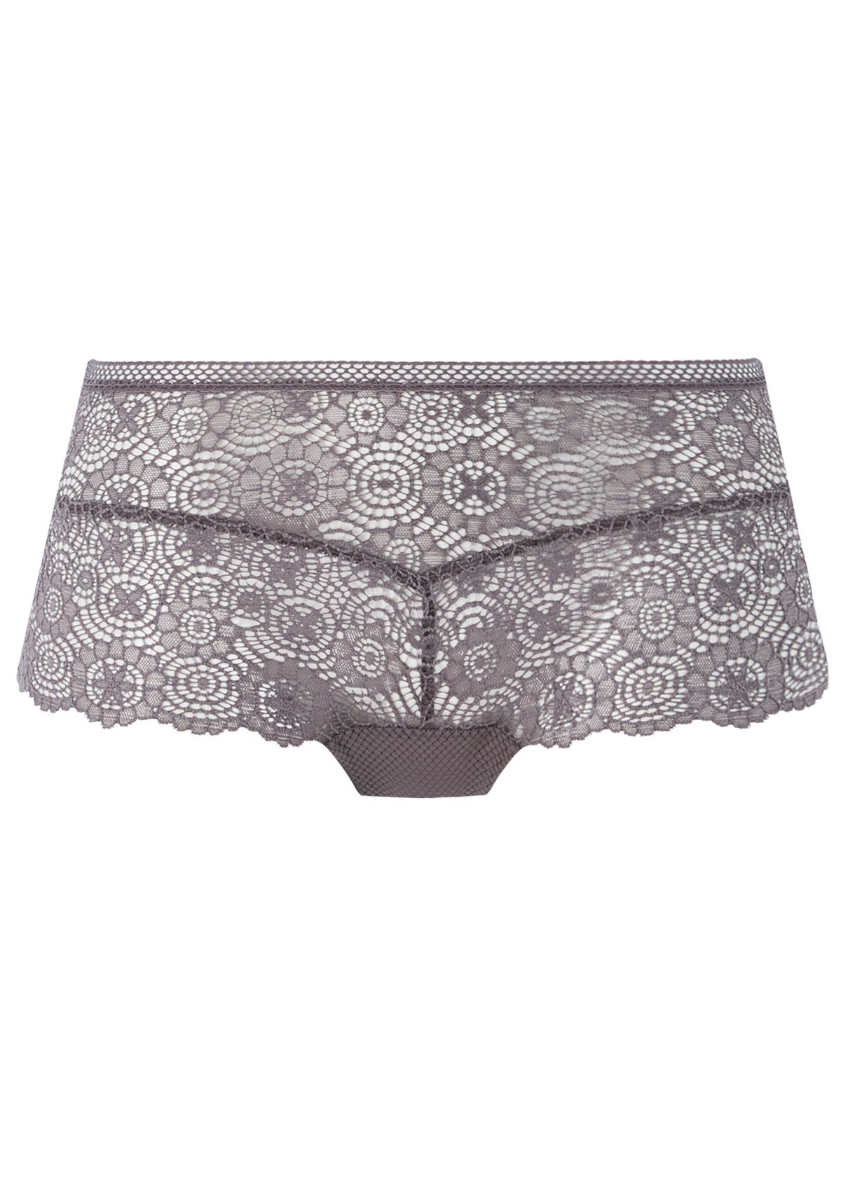 Lingerie confidence is yours with the luxurious Expression collection, featuring an intricate Short style in a classic Shark Grey colourway. Striking lace adorns the front and back with scalloped edging for a no VPL finish. A decorative waistband and satin bow detail completes the look in sizes XS – XL.