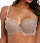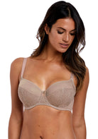Combining exquisite lace with a delicate metallic tear drop charm for an ultra-feminine look, Fantasie's Twilight Side Support Bra in Fawn provides forward projection and great uplift without compromising on comfort.