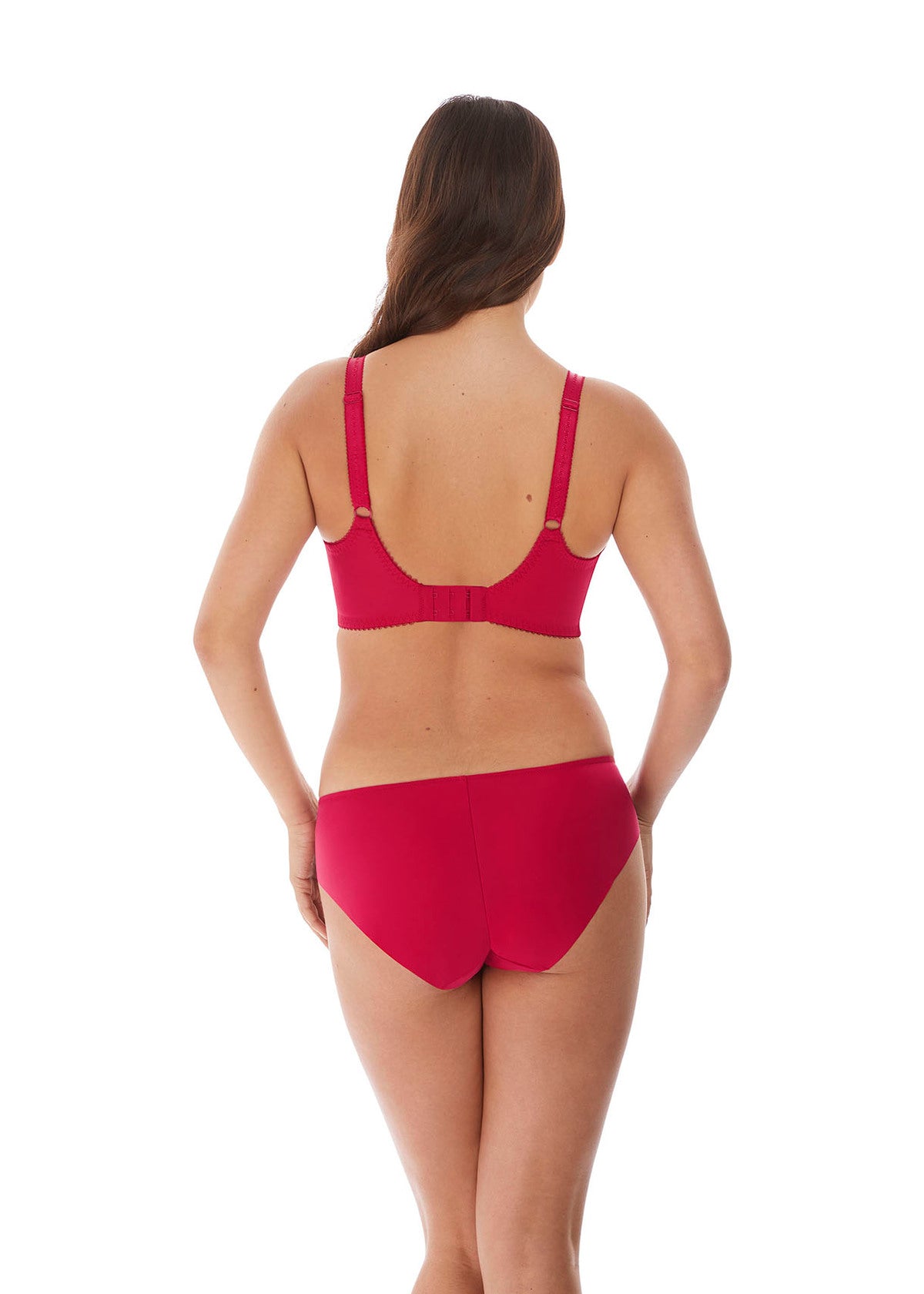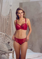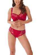 Discover Fantasie's Leona Balcony Bra in Red, featuring intricate embroidered cups for a luxurious look with a lined bottom cup for great shape.