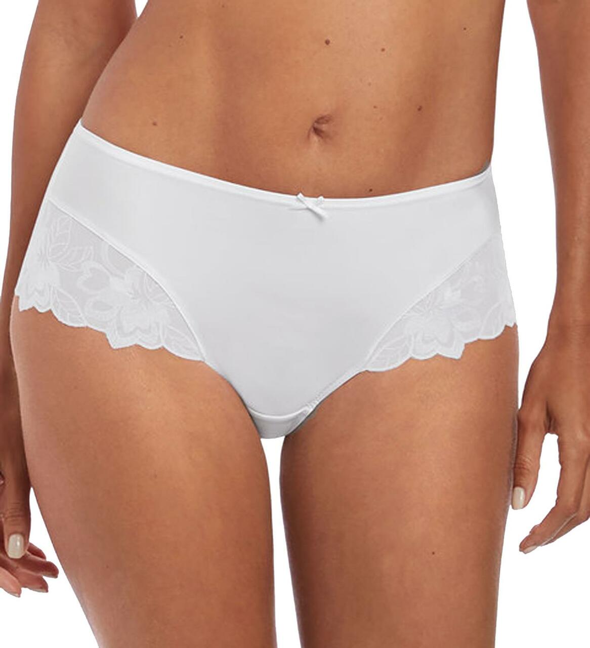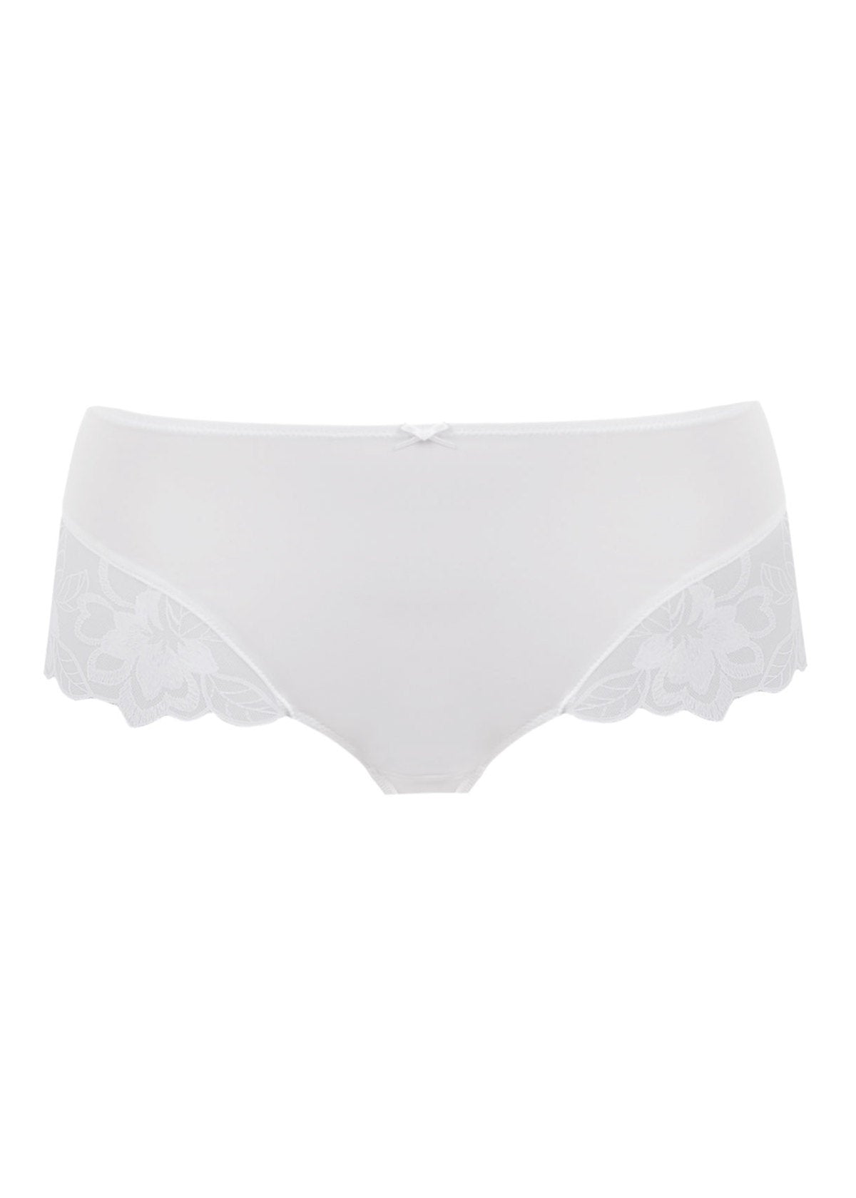 The Leona Full Brief in White provides good coverage and comfort with a smoothing no-show fabric for a second skin feel. Finished with elegant embroidery and a bow trim to complete the look.
