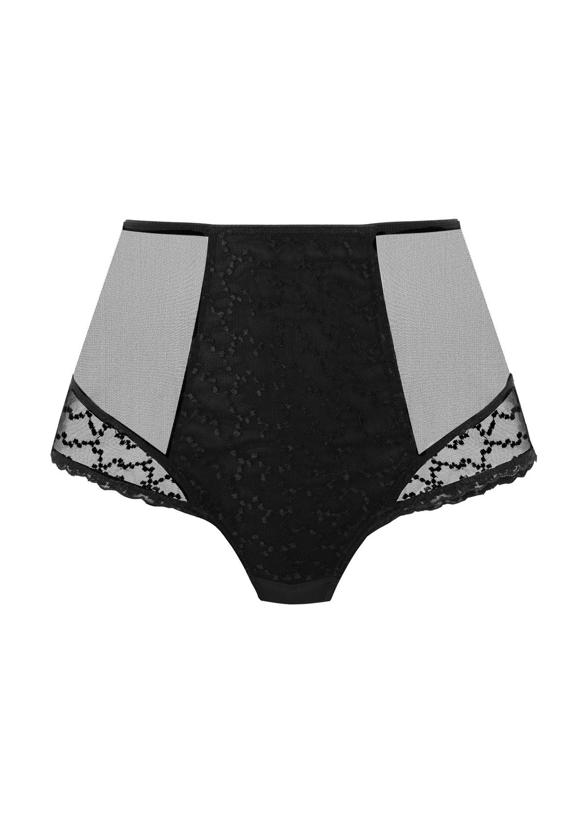 For light control and smoothing, discover the Ana High Waist Brief in Black, crafted from a soft fabric with stretch embroidery adorning the front leg and a scallop edge detail for no VPL under clothing.