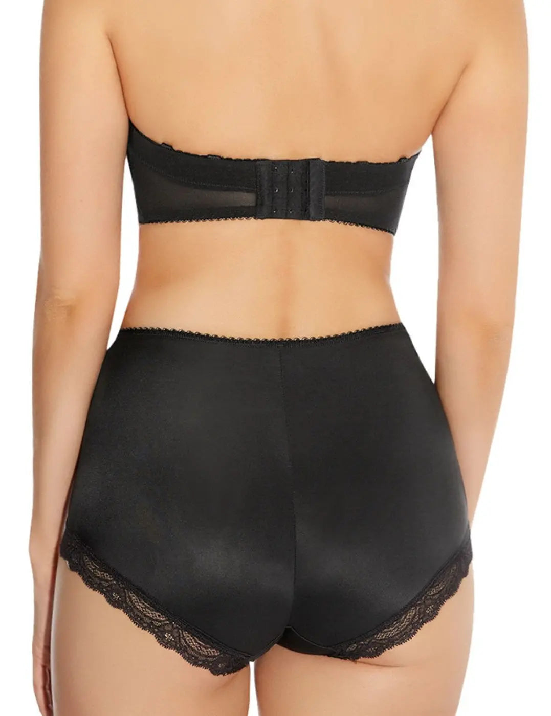 The Fantasie Mae high waist brief will give you amazing stomach control and smoother shape. The brief offers full rear covarge and comes with lace leg opening for a comfortable all day fit. This brief offers a sophisticated look with intricate floral lace trim and satin bows.