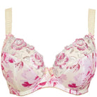 Opaque printed simplex multi-panel bottom cup paired with a three-tone embroidered top cup in pink large scale floral motifs ensure fantastic support, shape, and separation