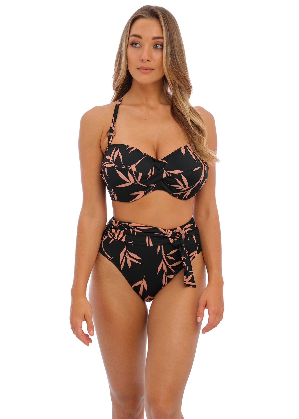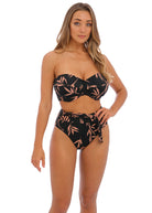 Poolside sophistication is yours with Fantasie's Luna Bay collection in Lacquered Black. Bamboo leaves in mink tones sit against a contrasting black backdrop, while a twist front detail creates a flattering sweetheart neckline on our much-loved Bandeau Bikini Top. The shoulder straps on this style are fully adjustable and detachable to allow multiway styling.