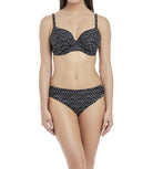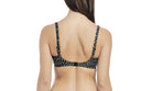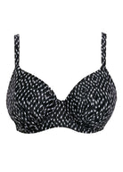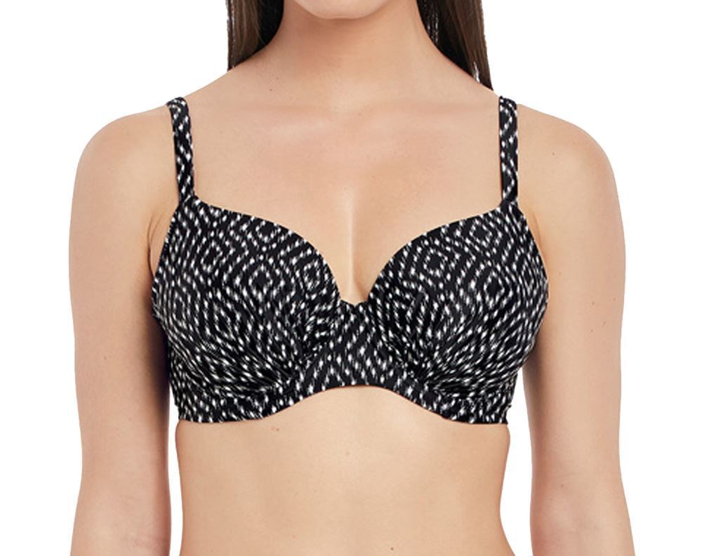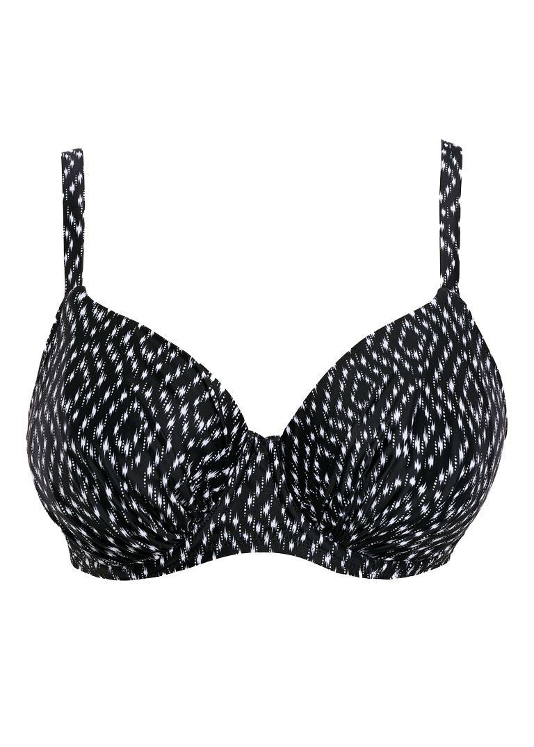 Fantasie Swimwear Byron Bay underwired gathered bikini top. It is underwired, with a geometric print. The bikini top has adjustable straps and a snap clasp fastening at the back.