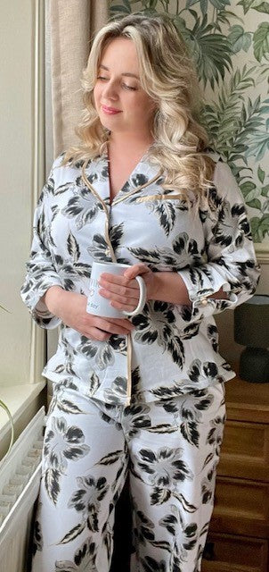 The pyjama top has 4 covered buttons, contrast gold satin banding and button cuff detail. The lounging full length pyjama pants feature side entry pockets a gently elasticated waistband, contrast gold satin banding and tie detail.
