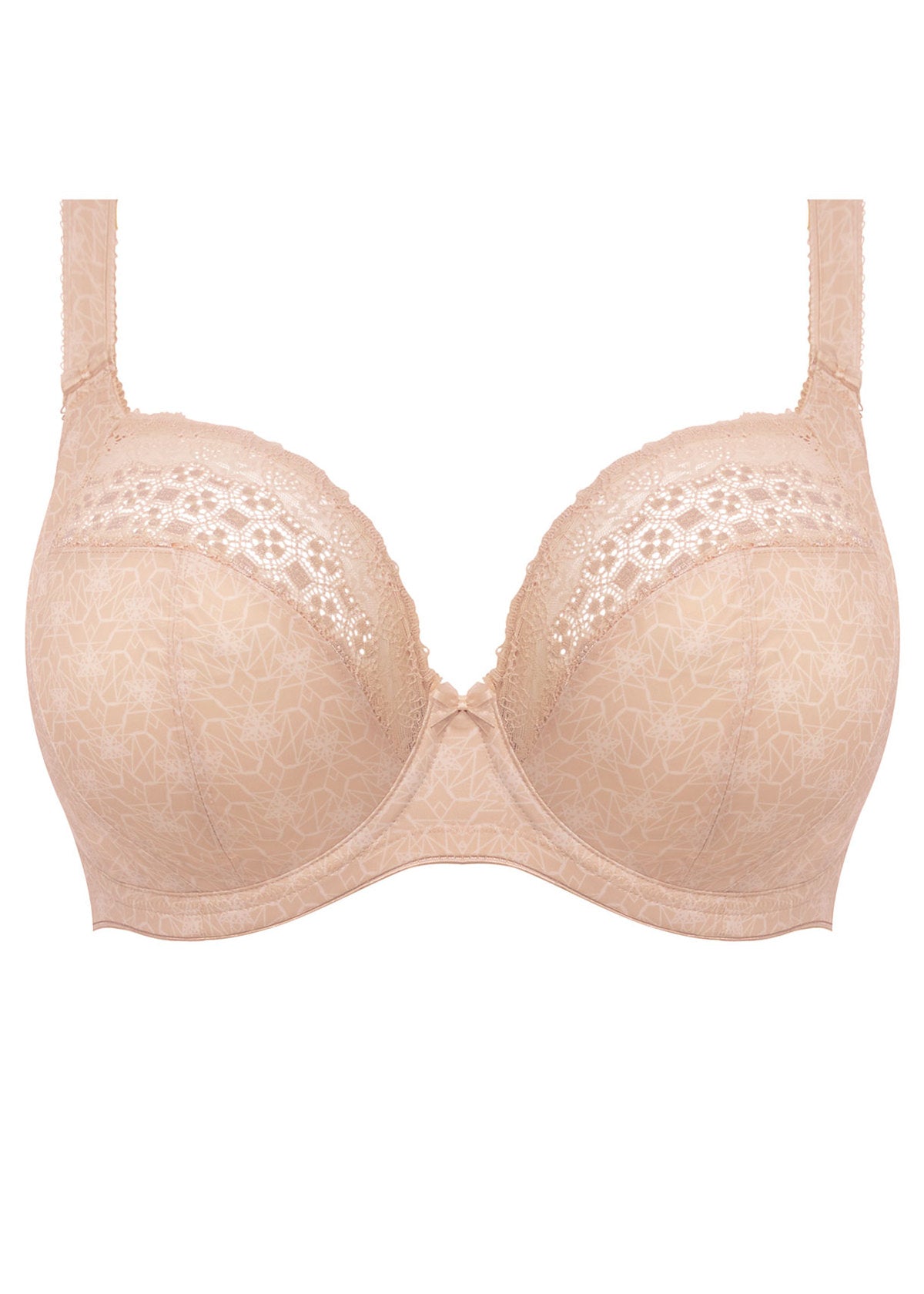 The Kim Plunge Bra in Caramel is an everyday must-have. Providing uplift and support for a great rounded shape and a low cut neckline for plunge without push up. A subtle linear geometric print is teamed with pretty lace top cups for a contemporary look in sizes D – JJ.