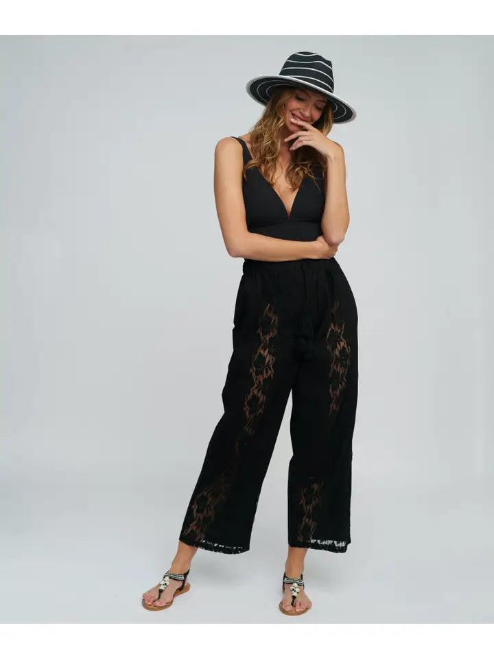 Unleash your inner chic with our Black Ola Trousers. Made from cool cotton, these beach trousers feature a stylish lace panel front and a chunky waist tassel tie for a touch of sophistication. The pretty lace insert down the centre adds a feminine touch, while the elasticated waistband offers flexibility and comfort. Made from a soft and comfy fabric, these trousers are perfect for any occasion.