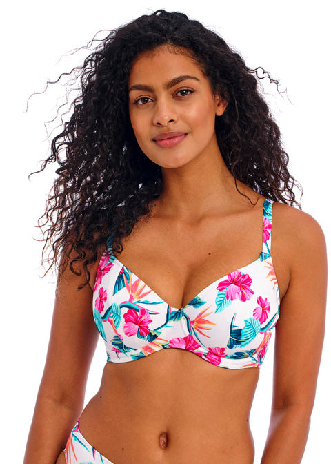 Chase the waves in our last collection of the season, Palm Paradise. Hibiscus flowers in hot pink are paired with warm coral birds of paradise, rich jade palms and a splash of lime. A fresh take on a tropical this season, on an optic white ground, complimented with gold bead details.